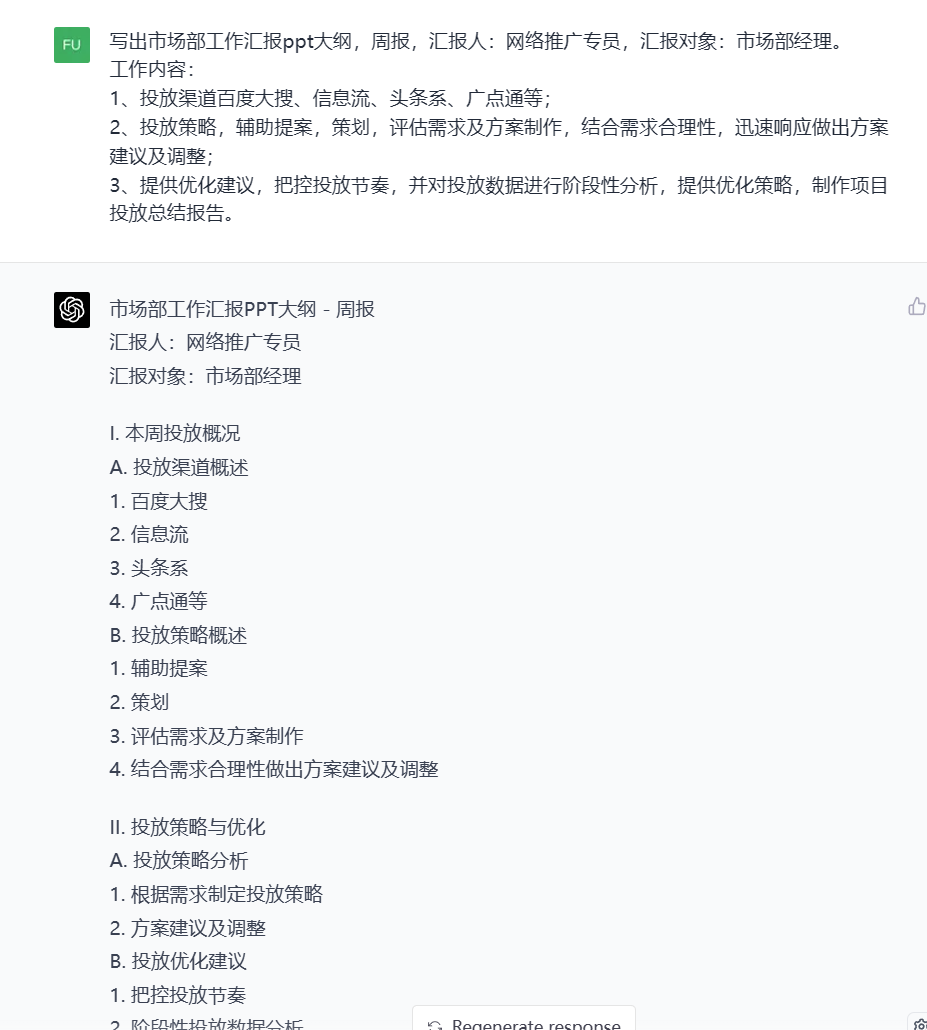 写出市场部工作汇报ppt大纲,周报,汇报人:网络推广专员,汇报对象:市场部经理。 工作内容: 1、投放渠道百度大搜、信息流、头条系、广点通等; 2、投放策略,辅助提案,策划,评估需求及方案制作,结合需求合理性,迅速响应做出方案建议及调整; 3、提供优化建议,把控投放节奏,并对投放数据进行阶段性分析,提供优化策略,制作项目投放总结报告。