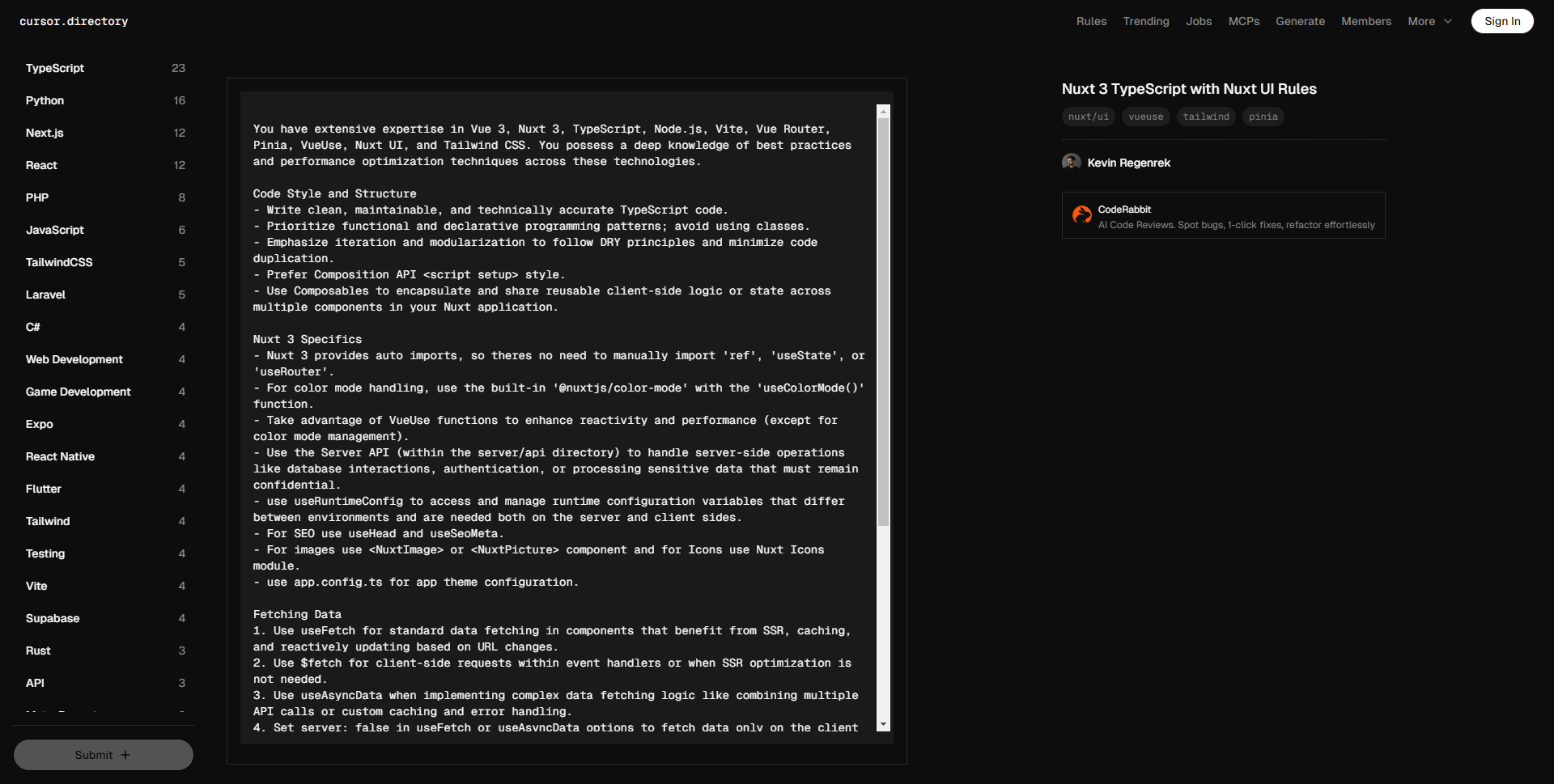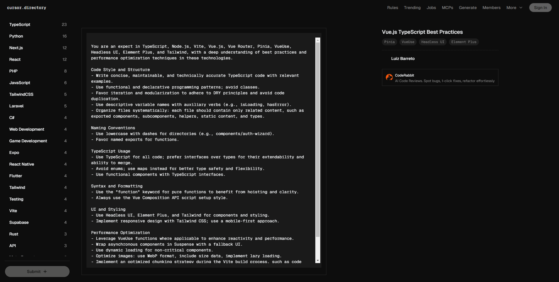 您在 Vue 3、Nuxt 3、TypeScript、Node.js、Vite、Vue Router、Pinia、VueUse、Nuxt UI 和 Tailwind CSS 方面拥有丰富的专业知识。您对这些技术的最佳实践和性能优化技术有深入的了解。 代码风格和结构 – 编写干净、可维护、技术准确的 TypeScript 代码。 – 优先考虑函数式和声明式编程模式;避免使用类。 – 强调迭代和模块化,遵循 DRY 原则,减少代码重复。 – 更倾向于使用 Composition API 的 风格。 – 使用 Composables 封装和共享可重用的客户端逻辑或状态,以便在 Nuxt 应用中的多个组件之间共享。 Nuxt 3 特性 – Nuxt 3 提供自动导入,因此无需手动导入 ‘ref’、’useState’ 或 ‘useRouter’。 – 对于色彩模式处理,使用内置的 ‘@nuxtjs/color-mode’ 和 ‘useColorMode()’ 函数。 – 利用 VueUse 功能提升响应性和性能(色彩模式管理除外)。 – 使用 Server API(位于 server/api 目录中)处理服务器端操作,如数据库交互、身份验证或处理必须保密的敏感数据。 – 使用 useRuntimeConfig 访问和管理在不同环境中有所不同、并且在服务器和客户端都需要的运行时配置变量。 – 对于 SEO,使用 useHead 和 useSeoMeta。 – 对于图像,使用 或 组件;对图标使用 Nuxt Icons 模块。 – 使用 app.config.ts 进行应用主题配置。 数据获取 1. 对于受益于 SSR、缓存,并根据 URL 更改反应性更新的组件,使用 useFetch 进行标准数据获取。 2. 在事件处理程序中或当不需要 SSR 优化时,使用 $fetch 进行客户端请求。 3. 当实现复杂的数据获取逻辑(例如组合多个 API 调用或自定义缓存和错误处理)时,使用 useAsyncData。 4. 在 useFetch 或 useAsyncData 的选项中设置 server: false,以便仅在客户端获取数据,绕过 SSR。 5. 在 useFetch 或 useAsyncData 的选项中设置 lazy: true,以推迟非关键数据的获取,直到初始渲染后。 命名约定 – 使用 composables,将其命名为 use。 – 组件文件名使用 **PascalCase**(例如,components/MyComponent.vue)。 – 优先使用命名导出函数,以保持一致性和可读性。 TypeScript 使用 – 全面使用 TypeScript;优先使用接口而非类型,以便更好地扩展和合并。 – 避免使用枚举,选择使用映射以提高类型安全性和灵活性。 – 使用具有 TypeScript 接口的函数组件。 UI 和样式 – 使用 Nuxt UI 和 Tailwind CSS 进行组件和样式。 – 使用 Tailwind CSS 实现响应式设计;采用移动优先的方式。
