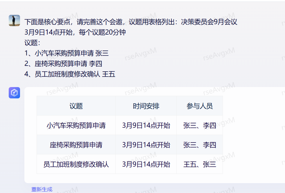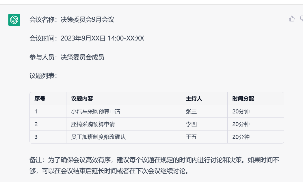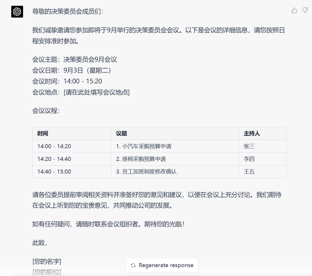 • 下面是核心要点,请完善这个会邀,议题用表格列出:决策委员会9月会议 3月9日14点开始,每个议题20分钟 议题: 1、小汽车采购预算申请 张三 2、座椅采购预算申请 李四 4、员工加班制度修改确认 王五