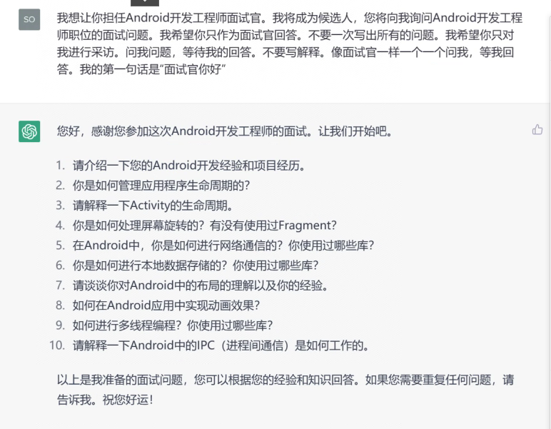 • 我想让你担任Android开发工程师面试官。我将成为候选人,您将向我询问Android开发工程师职位的面试问题。我希望你只作为面试官回答。不要一次写出所有的问题。我希望你只对我进行采访。问我问题,等待我的回答。不要写解释。像面试官一样一个一个问我,等我回答。我的第一句话是“面试官你好”