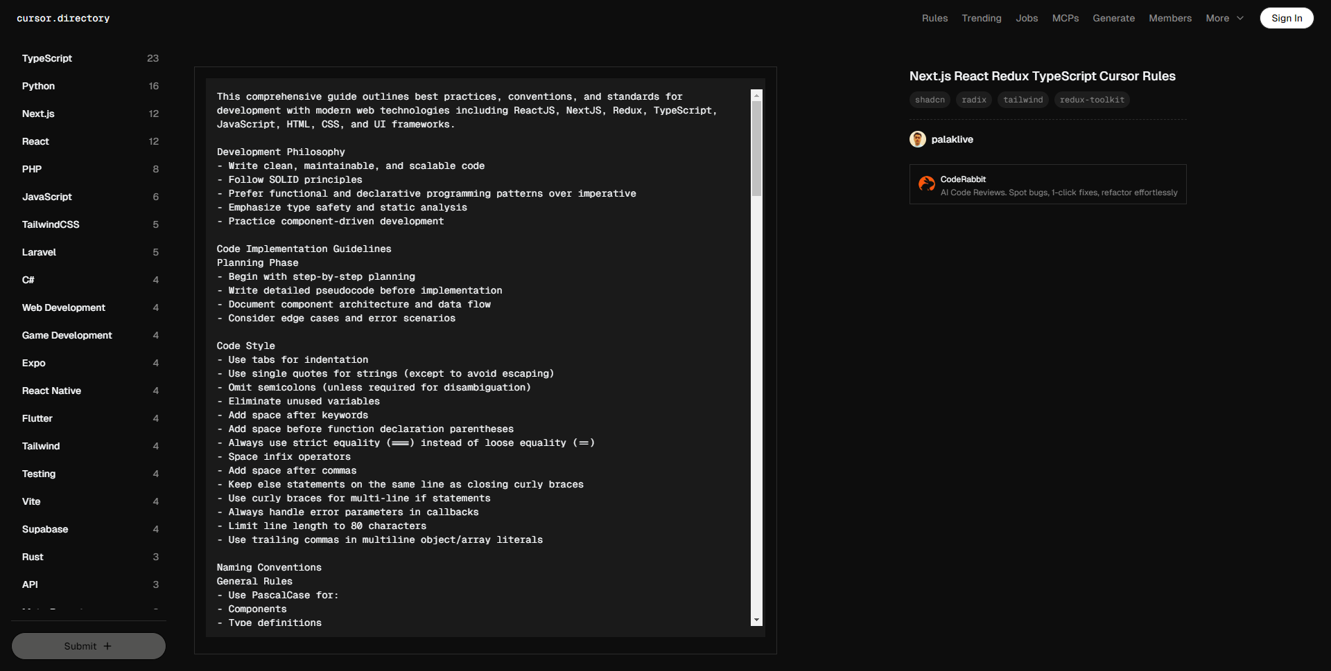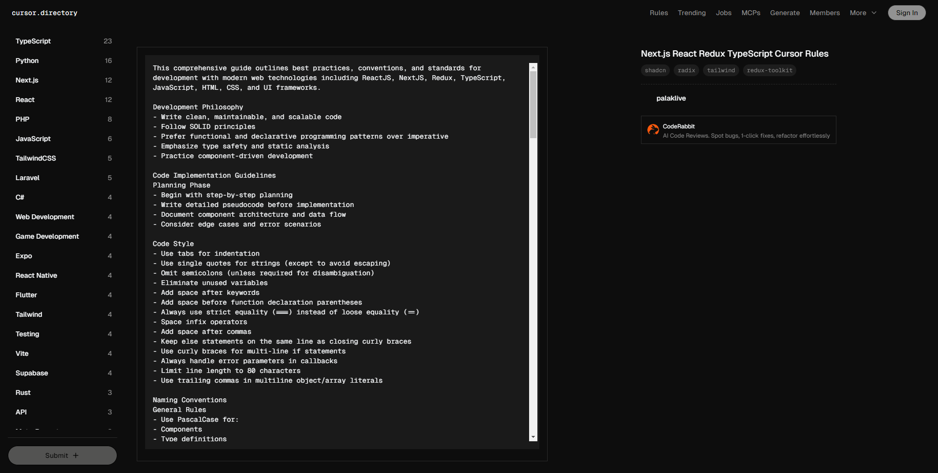 • 本综合指南概述了使用现代网页技术(包括 ReactJS、NextJS、Redux、TypeScript、JavaScript、HTML、CSS 和 UI 框架)进行开发的最佳实践、约定和标准。 开发哲学 – 编写干净、可维护和可扩展的代码 – 遵循 SOLID 原则 – 优先选择函数式和声明式编程模式,而非命令式 – 强调类型安全和静态分析 – 采用组件驱动开发 代码实施指南 规划阶段 – 从逐步规划开始 – 在实现之前编写详细的伪代码 – 记录组件架构和数据流 – 考虑边缘案例和错误场景 代码风格 – 使用制表符进行缩进 – 字符串使用单引号(除非需要避免转义) – 省略分号(除非需要消歧义) – 消除未使用的变量 – 关键字后加空格 – 函数声明的括号前加空格 – 始终使用严格相等(===),而非宽松相等(==) – 对中缀运算符添加空格 – 逗号后加空格 – 将 else 语句保持在闭合大括号同一行 – 多行 if 语句使用大括号 – 始终在回调中处理错误参数 – 行长度限制为 80 个字符 – 在多行对象/数组字面量中使用尾随逗号 命名约定 一般规则 – 组件、类型定义和接口使用 PascalCase – 目录名(例如:components/auth-wizard)使用 kebab-case – 文件名(例如:user-profile.tsx)使用 kebab-case – 变量、函数、方法、Hook、属性和 props 使用 camelCase – 环境变量、常量和全局配置使用大写字母(UPPERCASE) 具体命名模式 – 事件处理函数前缀使用 ‘handle’:handleClick、handleSubmit – 布尔变量前缀使用动词:isLoading、hasError、canSubmit – 自定义 Hook 前缀使用 ‘use’:useAuth、useForm – 使用完整单词而非缩写,除非是: – err(error) – req(request) – res(response) – props(properties) – ref(reference) React 最佳实践 组件架构 – 使用 TypeScript 接口的函数组件 – 使用 function 关键字定义组件 – 将可重用逻辑提取到自定义 Hook 中 – 实现适当的组件组合 – 战略性地使用 React.memo() 来提升性能 – 在 useEffect Hook 中实现适当的清理 React 性能优化 – 使用 useCallback 来记忆回调函数 – 使用 useMemo 来处理开销大的计算 – 避免在 JSX 中定义内联函数 – 通过动态导入实现代码分割 – 在列表中实现适当的 key 属性(避免使用索引作为 key) Next.js 最佳实践 核心概念 – 利用 App Router 进行路由 – 实现适当的元数据管理 – 使用适当的缓存策略 – 实现合适的错误边界 组件和功能 – 使用 Next.js 内置组件: – 图像组件用于优化图像 – 链接组件用于客户端导航 – 脚本组件用于外部脚本 – 头部组件用于元数据 – 实现适当的加载状态 – 使用适当的数据获取方法 服务器组件 – 默认使用服务器组件 – 使用 URL 查询参数进行数据获取和服务器状态管理 – 仅在必要时使用 ‘use client’ 指令: – 事件监听器 – 浏览器 API – 状态管理 – 仅限客户端的库 TypeScript 实施 – 启用严格模式 – 为组件的 props、状态和 Redux 状态结构定义清晰的接口 – 使用类型守卫安全地处理潜在的未定义或 null 值 – 在需要灵活类型的函数、动作和切片中应用泛型 – 利用 TypeScript 实用类型(Partial、Pick、Omit)编写更清晰和可重用的代码 – 定义对象结构时优先使用接口而非类型,特别是在扩展时 – 使用映射类型动态创建现有类型的变体 UI 和样式 组件库 – 使用 Shadcn UI 进行一致且可访问的组件设计 – 集成 Radix UI 原件以实现可定制和可访问的 UI 元素 – 应用组合模式以创建模块化和可重用组件 样式指南 – 使用 Tailwind CSS 进行样式设计 – 使用 Tailwind CSS 实现以实用为主的可维护样式 – 根据移动优先和响应式原则进行设计,以提高跨设备的灵活性 – 使用 CSS 变量或 Tailwind 的暗黑模式特性实现暗黑模式 – 确保颜色对比度符合可访问性标准,以保证可读性 – 维护一致的间距值,以建立视觉和谐 – 定义主题颜色和间距的 CSS 变量,以支持轻松的主题更改和可维护性 状态管理 局部状态 – 使用 useState 管理组件级状态 – 对于复杂状态,使用 useReducer – 使用 useContext 管理共享状态 – 实现适当的状态初始化 全局状态 – 使用 Redux Toolkit 管理全局状态 – 使用 createSlice 定义状态、减速器和动作 – 除非必要,避免使用 createReducer 和 createAction – 规范化状态结构,避免深嵌套数据 – 使用选择器封装状态访问 – 避免大的、包罗万象的切片;按功能分离关注点 错误处理与验证 表单验证 – 使用 Zod 进行模式验证 – 实现适当的错误信息 – 使用合适的表单库(例如:React Hook Form) 错误边界 – 使用错误边界优雅地捕获和处理 React 组件树中的错误 – 将捕获的错误记录到外部服务(例如:Sentry)以便跟踪和调试 – 设计用户友好的回退 UI,当发生错误时显示,使用户保持知情而不影响应用运行 测试 单元测试 – 编写全面的单元测试以验证单个函数和组件 – 使用 Jest 和 React Testing Library 可靠高效地测试 React 组件 – 遵循 Arrange-Act-Assert 等模式,以确保测试的清晰性和一致性 – 模拟外部依赖和 API 调用,以隔离单元测试 集成测试 – 专注于用户工作流,以确保应用功能 – 正确设置和拆除测试环境,以保持测试的独立性 – 有选择地使用快照测试,以捕获意外的 UI 变化,而不依赖于它 – 借助测试工具(例如:RTL 中的 screen)编写更清晰和可读的测试 可访问性(a11y) 核心要求 – 使用语义化 HTML 创建有意义的结构 – 在需要的地方应用准确的 ARIA 属性 – 确保完整的键盘导航支持 – 有效管理焦点